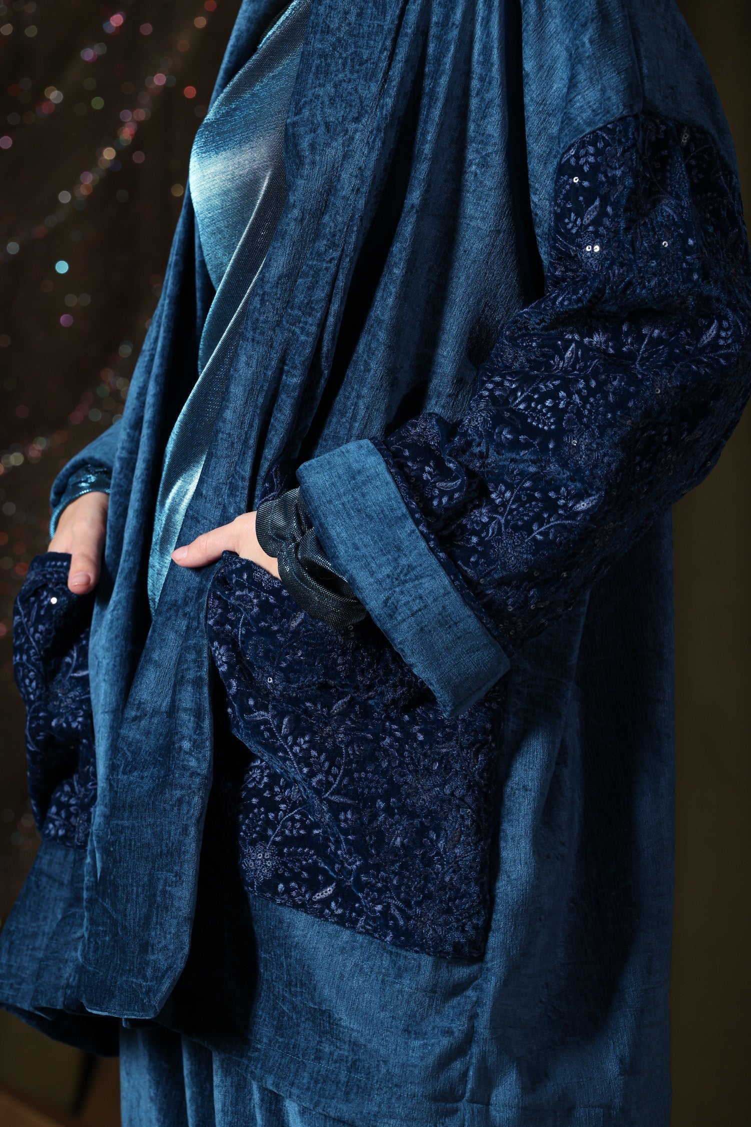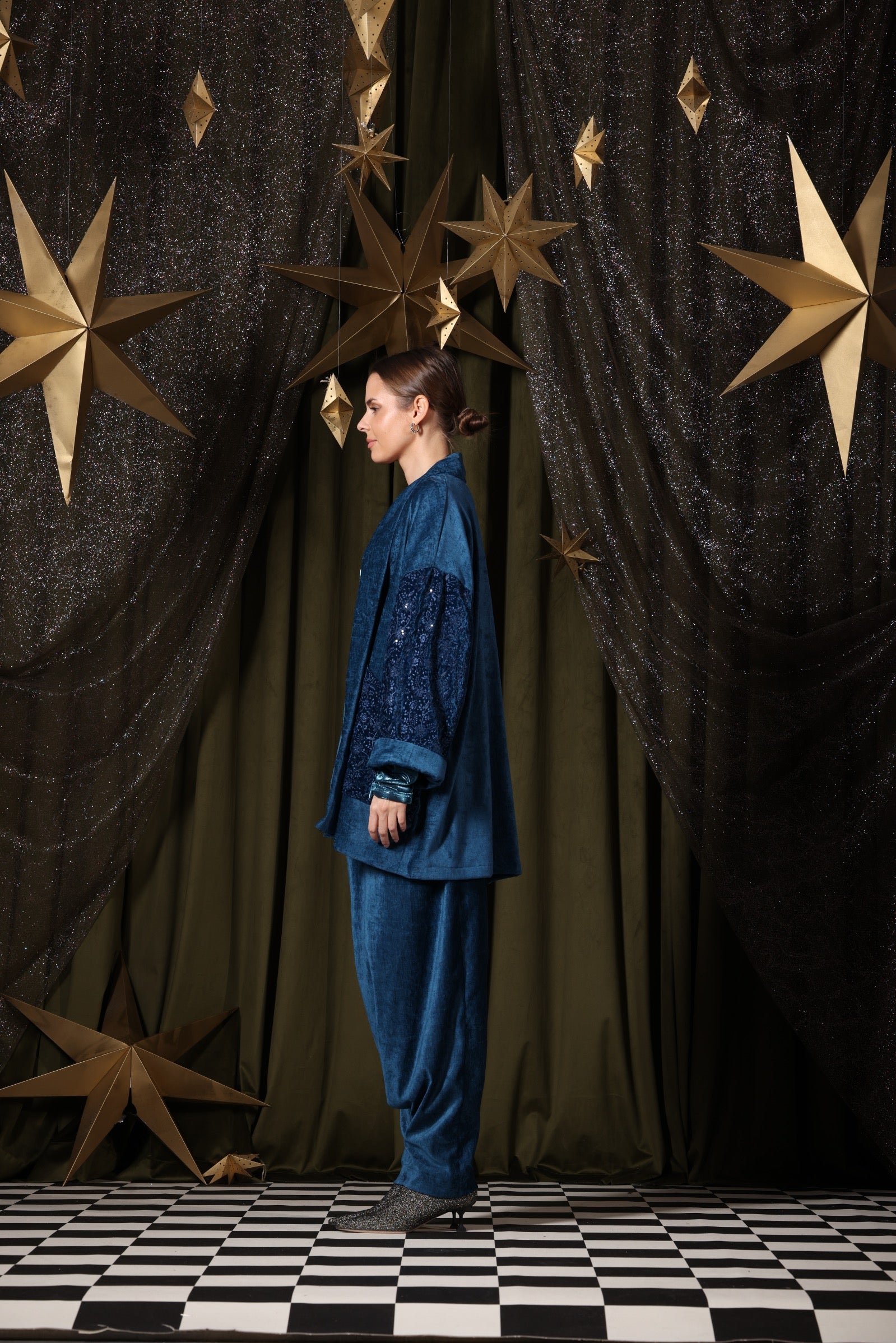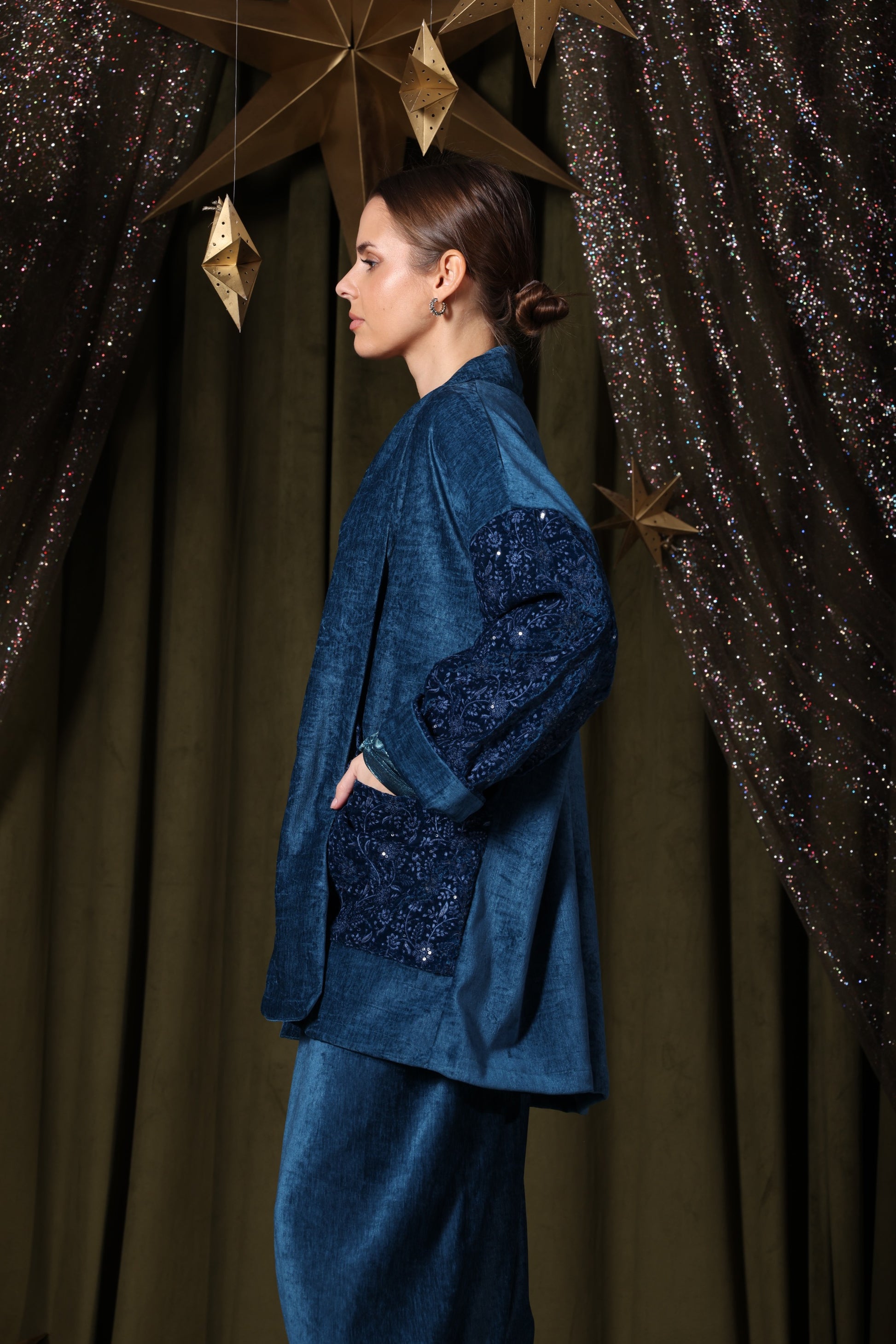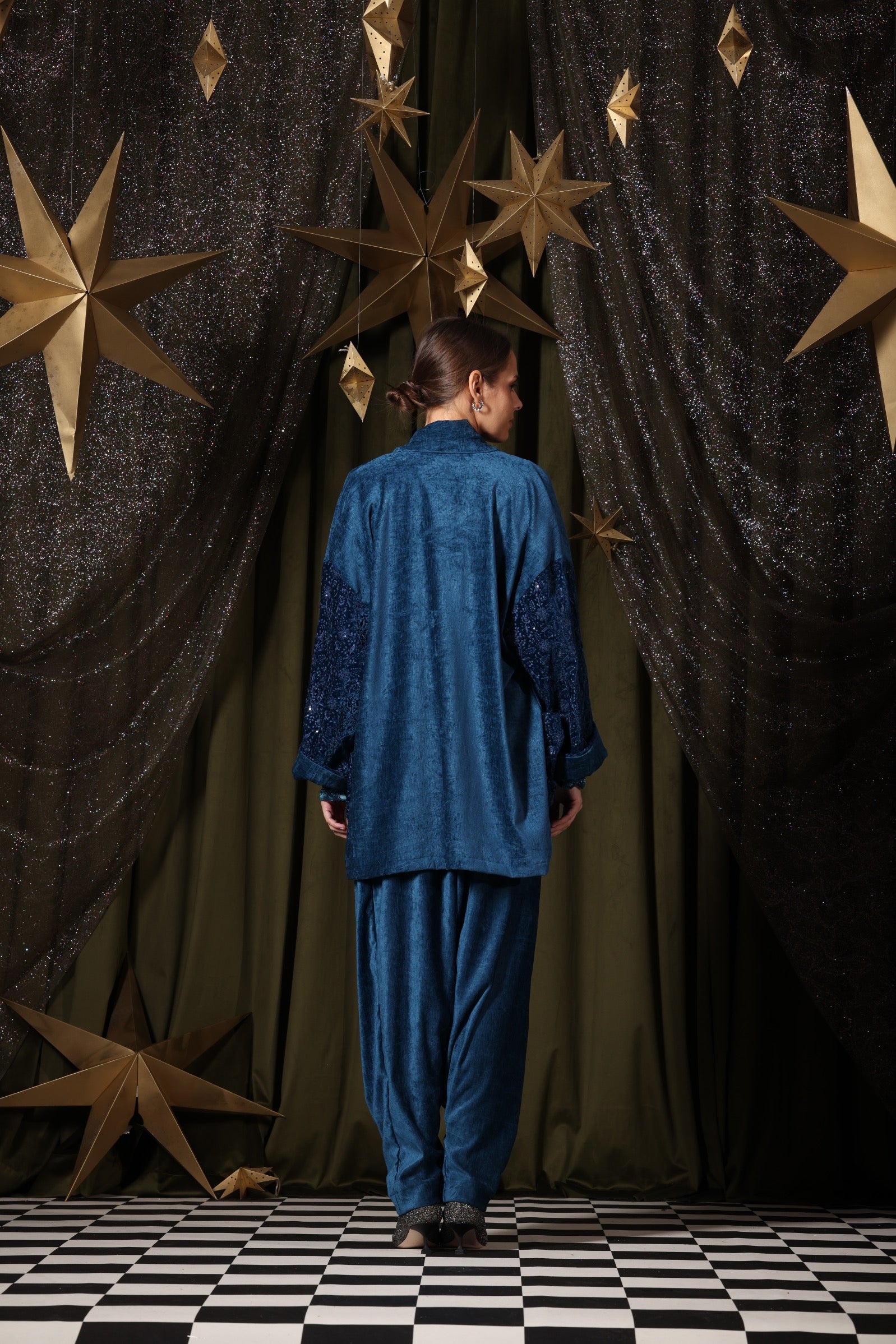 A deep-blue 3-piece velvet set for mothers and daughters, featuring a velvet sherwal, matching jacket, and a stretchy inner top—designed for comfort with effortless elegance.